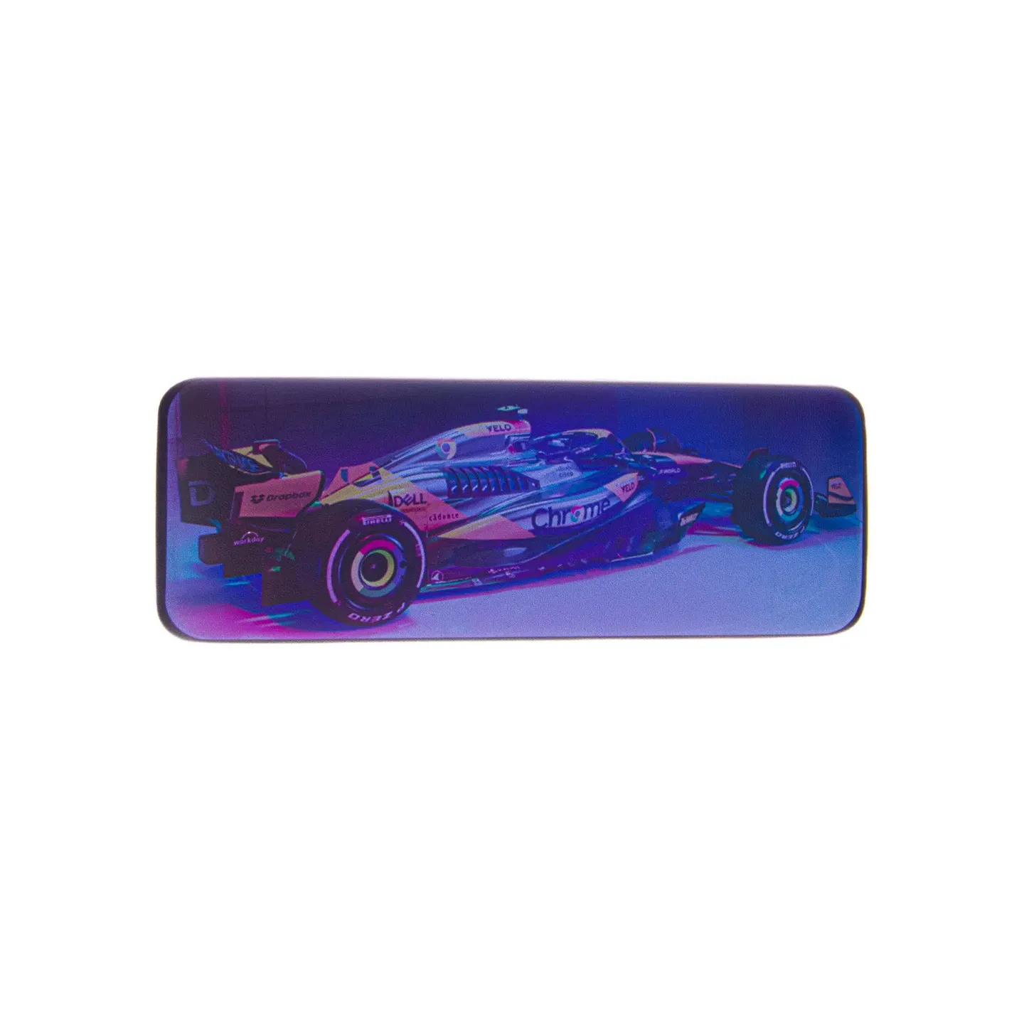A szemüvegtok mintázata egy nagy sebességű Forma-1-es autót ábrázol, amely dinamikus és futurisztikus megvilágításban jelenik meg. A grafika vibráló neonfényekkel van kiemelve, főként kék, lila és rózsaszínes árnyalatokkal, amelyek a modern motorsport és a technológiai fejlődés hangulatát idézik.A karosszéria részletei, a légbeömlők és az oldalsó szárnyak is realisztikusan vannak ábrázolva, mintha egy valódi versenypályán készült fényképről lenne szó.